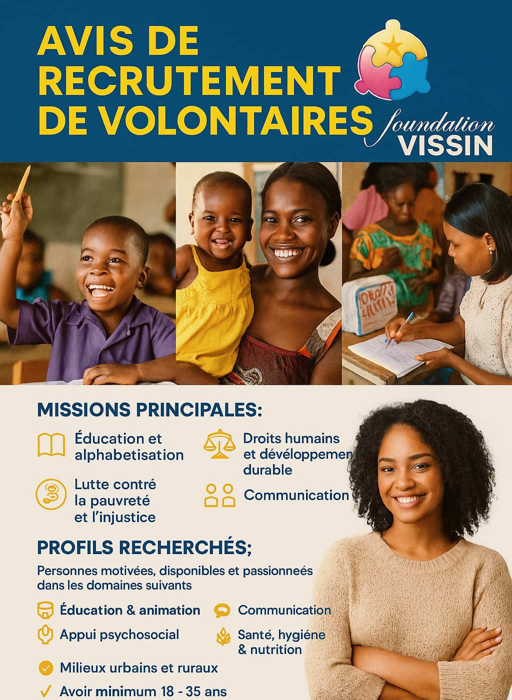 La Fondation VISSIN lance un appel à volontaires engagés pour contribuer à l’amélioration des conditions de vie des femmes, des enfants et des personnes en situation de vulnérabilité.
